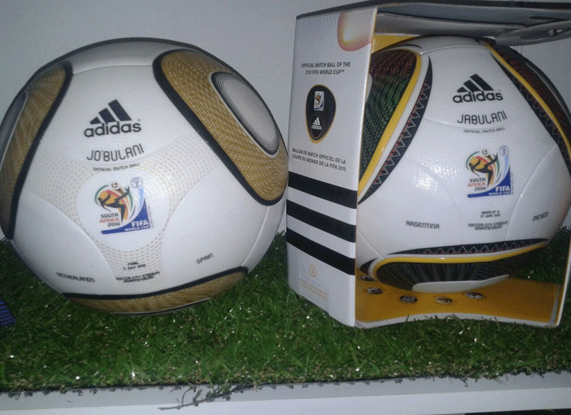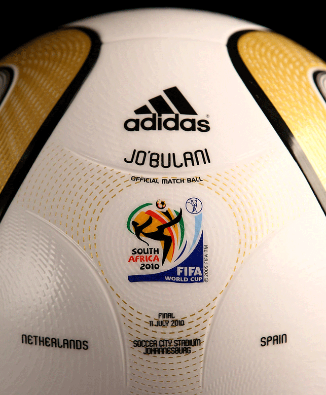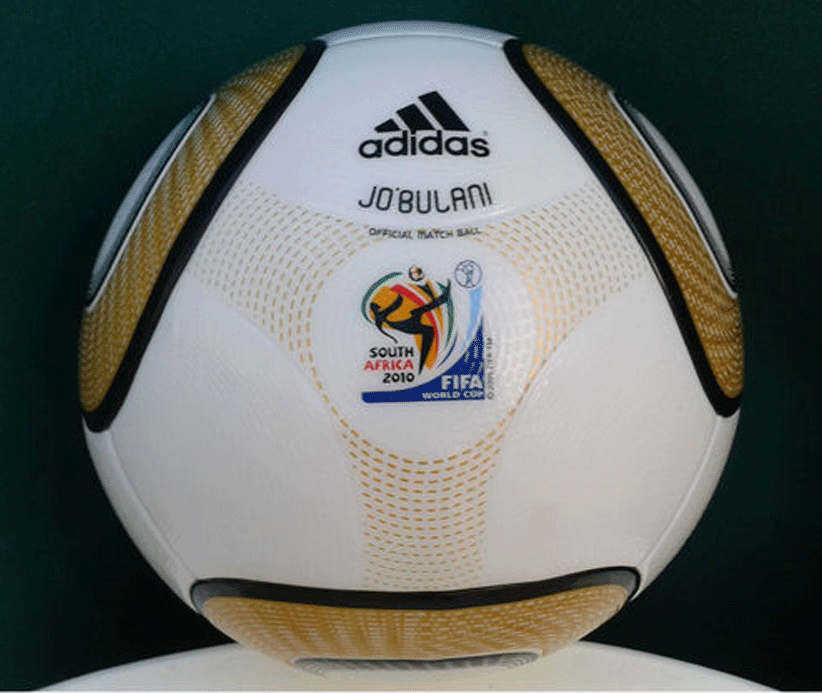 El balón oficial del Mundial de Sudáfrica en 2010 fue el Jabulani. Al igual que su predecesor también continua formado por grandes paneles para conseguir la mayor superficie lisa. Pero técnicamente hablando dicha superficie tiene unas rugosidades para hacer que el balón se controle mejor. Los 11 colores que tiene el balón simboliza a los 11 jugadores de un equipo, a los 11 idiomas oficiales que hay en Sudáfrica, a las 11 comunidades que forman Sudáfrica. Los dibujos del balón representan al estadio donde se jugó la final, el Soccer City Stadium.