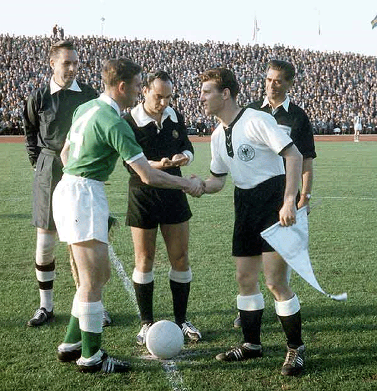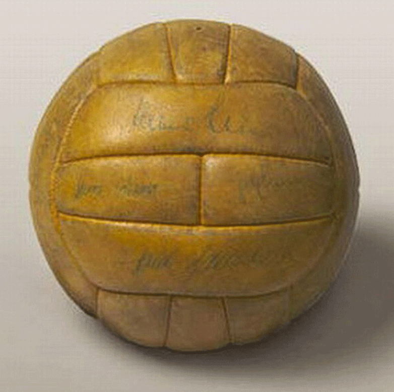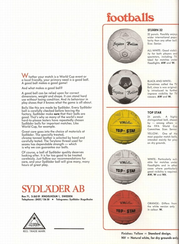 Ball used on The World Cup in Sweden 1958. This ball was made of genuine leather and it consisted of 25 panels.. For this tournament were used two ball models with different color, brown and white one. The white model was used on the last matches, but not in the final. It had a bladder like the current balls to be inflated. Available at store. Garrincha dribbling an opponent with Top-Star model (picture above).