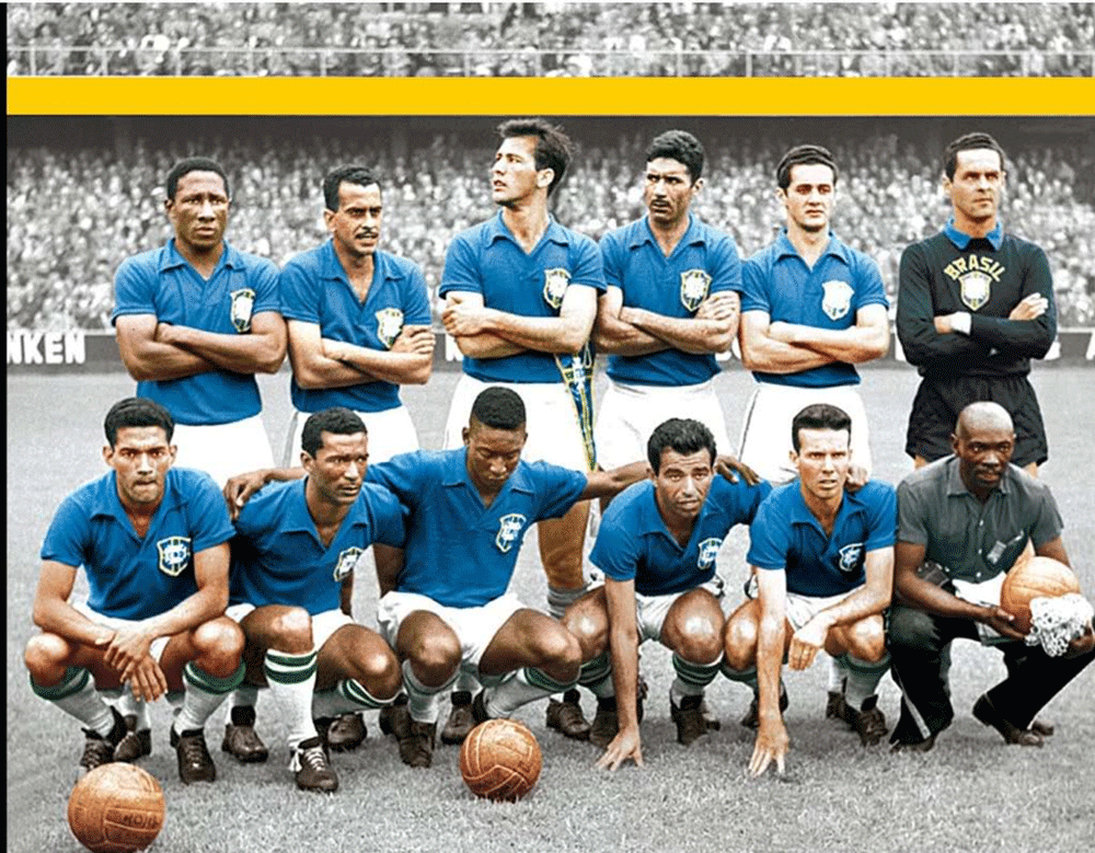 Above we see the Brazil team which was the champion of the world on that tournament. The picture shows a young Pele looking at the floor (the third player from the right in the bottom row).