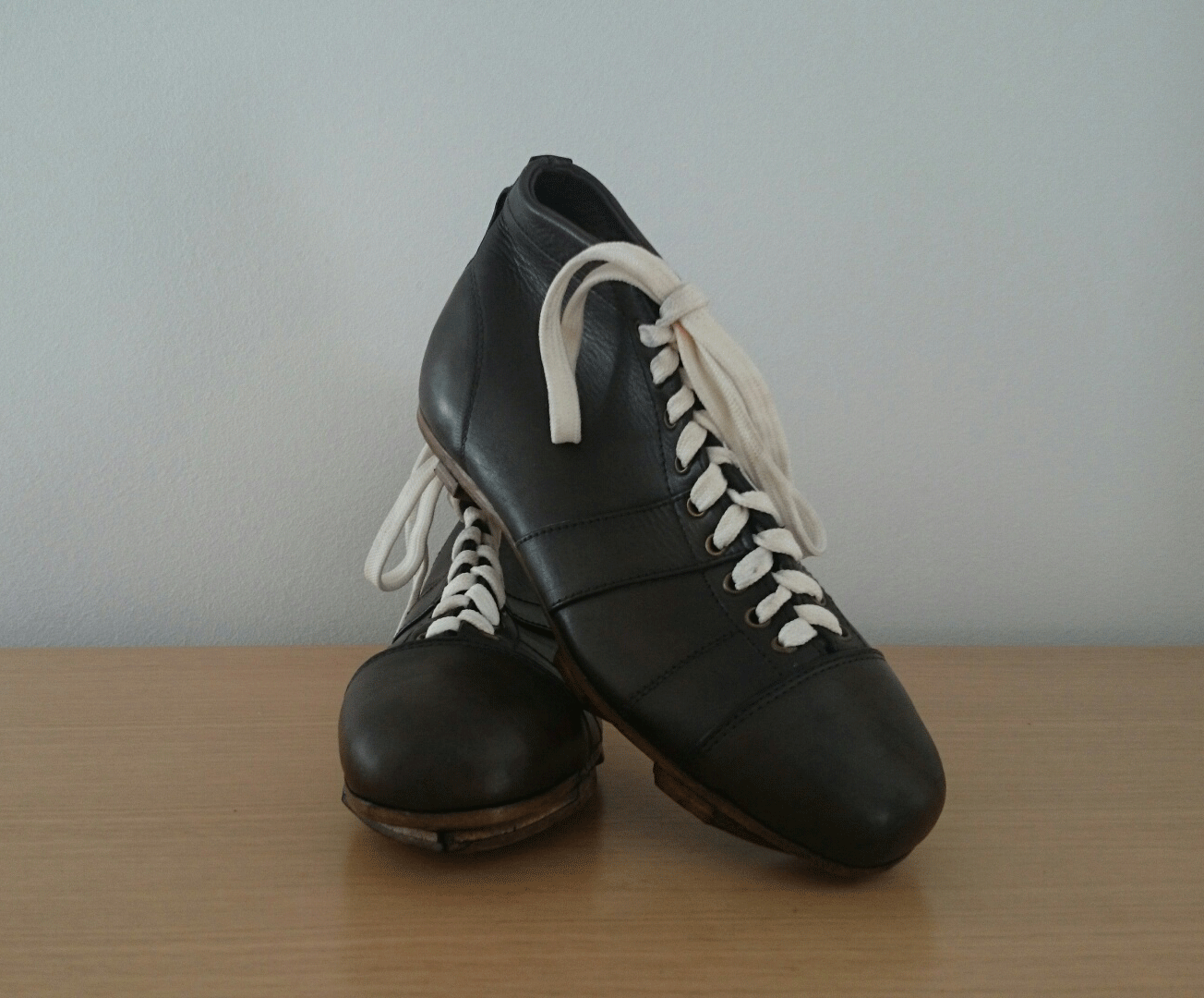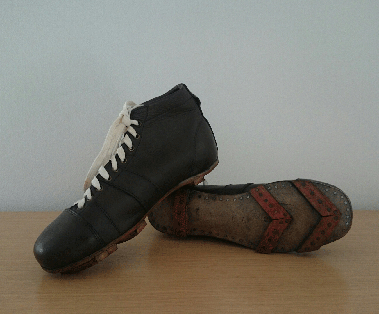 Este modelo de botas son las que comúnmente se solían utilizar sobre 1850. Se puede decir que son las primeras botas de fútbol de la historia. Su color era totalmente negras y la característica más peculiar eran los tacos de madera alargados como se ve en la foto de la izquierda. Nada que ver con los tacos de hoy en día. Otra característica muy típica de aquellas botas de fútbol, y las venideras, era que realmente eran botas por la altura que tenían. A los jugadores les llegaba a cubrir casi el tobillo para evitar lesiones. Después y como hemos visto con el paso de los años las "botas" perdieron su altura y ya no cubrían el tobillo del jugador. La razón principal fue para dar más soltura al jugador con lo cual el espectáculo aumentó debido a mejores regates, goles...etc. |